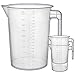 Pack of 3 - 5 Liter (5000 ml) sturdy plastic measuring and mixing cup pitchers. Each pitcher holds over 1-1/4 gallons (5 quarts) with a 200 fluid ounce capacity. The pitcher's stack and store easily because of the spout design and the open handles.