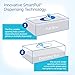 The innovative box has two separate openings (smaller for when box is full and a larger opening for easier access) to help control over-dispensing