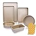 【Complete 6-Piece Bakeware Sets】: Includes 2-Piece Round Cake Pan, 1-Piece Roasting Pan, 2-Piece Cookie Sheets,1-Piece Loaf Pan. The bakeware sets with a Micro-textured pattern inside the bottom, 0.8mm thickness. Oven safe to 446 degrees F for versatility.