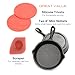 The 4-pack of tiny cast iron pans comes with 4 mini silicone trivets and a universal scraper for cast iron cookware. The red silicone trivets protect your table and countertop while giving a beautiful accent when serving your dish in the tiny skillets. The scraper for cast iron cookware makes cleaning up a breeze.
