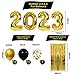 🎁【PACKAGE INCLUDE】Happy new year decorations set 2023 includes - 1 set happy new year banner,1 set "2""0""2""3" foil balloon,3 PCS gold foil fringe curtains,10 PCS gold and 10 PCS black latex balloons,6 PCS confetti latex balloons,1 PC black star and 1 PC gold star foil balloon,1 PC "HAPPY NEW YEAR" pentagram foil balloon,1 PC "HAPPY NEW YEAR" meteor foil balloon,1 PC "HAPPY NEW YEAR" champagne foil balloon,100 PCS glue dots and 1 PC ribbon.