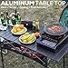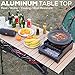 New wood grain color table top that you will sure like very much; Roll up anode oxidation treatment desktop, anti-rust, waterproof, easy to clean and set up; Heat resistant, can put your stove on; Tabletop area 15.7” × 15.7”; Height 15.7”