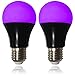 E26 A19 Medium Base blacklight light bulbs 2 pack. UV blacklight bulb, which human eye can see part of the light, so it will appear a bit dim when lit. It makes the pigment reactive materials or substances glow brighter in the dark. Diameter: 2.4 Inches, Height: 4.72 Inches.