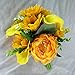 Hand-tied silk yellow sunflowers and orange peonies, Latex real touch yellow Calla lilies, with greenery and baby's breath, wrapped twine.