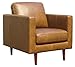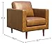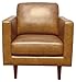 This modern armchair features simple lines and square armrests atop tall tapered legs, giving it a minimalist look that pairs well with most decor styles. The solid wood frame and leather upholstery make this armchair feel sturdy and substantial.