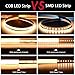 Super Bright and Linear: COB led strip lights is new and upgrade technology that compared with traditional SMD led strip, total 2400pcs(16.4ft/5m) led chips on pcb board, high density of leds and uniform light with widely emitting angle 180° it has, the effect of COB led rope lighting looks more linear and dot-free.