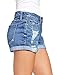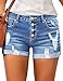 Button down ripped jeans shorts designed with distressing, whisker and fading. It's easy to tuck a plain blouse into these high rise denim short jeans for a relaxed look.