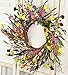 【Material】Handcrafted on a natural sturdy grapevine base with faux daisy flower, yellow designer foam flower blossoms, blue accent faux spring blooms, and yellow pip berries. perfect colors for an Easter wreath display as well.