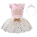 Toddler birthday outfit material: Sweet Birthday girl dress tank t shirt is soft cotton material.Baby birthday princess dress girl summer short tutu skirt is mesh tulle cotton blended. The princess birthday dress is soft and comfortable.Cute princess birthday outfit, shiny sequins skirt outfits make your little girl the star of bday party! Take this toddler birthday dress now!