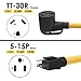 [Cord Rating]: MALE Plug 15Amp is NEMA 5-15, 125V. FEMALE Receptacle plug 30Amp is NEMA TT-30R, Rated for125V/250V max rate 3750 watts, 10/3 gauge STW wire.