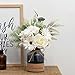 【REALISTIC LOOKING】The fake flowers with vase have realistic effect. It's suitable for dining table centerpieces, modern house decor and coffee table decor. The floral decor include 1 white roses bouquet and 1 glass vase with hand strap. The faux flowers made of premium silk cloth and the white color is soft and bright, close to the real flowers. The bouquet is also matched with a variety of artificial plants. High quality materials ensure that these flowers centerpiece table decorations never need watering or sunshine, and the flowers always bloom.