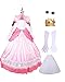 The whole costume is a pink ball gown dress, including a white petticoat,a pair of white gloves,a crown and a pair of earrings.