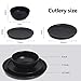 Black Matte plates, bowls, mugs - 10.25” dinner plates, 7. 5” Salad plates, 5. 6.3” bowls and 12 oz. Mugs have a cool, hip, ebony design.