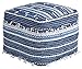 Handwoven home pouf furniture: This cotton material offers your home beautiful aesthetics that is also breathable and naturally resistant to static. Beige and white, then handwoven on a traditional pit loom into interlocking, angular shapes. With tassels made of the same yarns adorning the top corners, this exclusive pouf cover mixes effortlessly with other pieces in our Blue Page collection. Soft yet durable, it can be used indoors or outdoors.