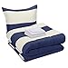 Twin-size set with Navy/Silver Stripe print includes a 66 x 90-inch comforter, 66 x 96-inch flat sheet, 38 x 74-inch fitted sheet, 20 x 30-inch pillowcase, and 20 x 26-inch sham