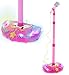 INCLUDED WITH THE PURCHASE OF PINK MICROPHONE FOR KIDS - Includes 1 Pink Super Star Karaoke Microphone Play Set, an adjustable microphone stand, & a light-up base, designed with a built-in speaker and auxiliary jack to connect to any MP3 music player. This battery-operated microphone karaoke toy has a telescopic stand that can be adjusted from 15.75" to 32.25" inches in height, perfect for little kids. Requires 3xAA Batteries, not included.