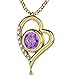 HEART-SHAPED I LOVE YOU NECKLACE IN 12 LANGUAGES inscribed in 24k gold onto a purple crystal Swarovski stone, 0.3 inches, prong set into the gold plated silver, vermeil, romantic heart shaped pendant for women, 1x0.65 inches, embellished by 8 tiny clear crystal cubic zirconia gemstones
