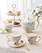 A SPACE SAVER & EASY TO MOVE - Porcelain cup/saucer set with a stacking stand to keep the set together, takes up very little countertop space. The stand is a big plus, makes it easy to move around from the kitchen to the living room for hosting purposes.