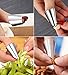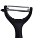 Swiveling twin blades with flexible action easily peel potatoes, apples and other tough skinned fruits and vegetables, built in potato eye remover.