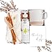 The Perfect Thinking Of You Gift - Comfort gifts for anyone in need of a thoughtful gift. The care package includes cozy white socks, cream speckled ceramic mug, cedarwood chai tea set, mini honey jar, cinnamon sticks & a bonus greeting card