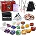 🎁Premium Healing Crystals Set: 7pcs therapy raw chakra stones, 10pcs tumbled stone, 1pc spiritual pink healing crystal necklace, 1pc natural pink crystal pendulum, 1pc white crystal pyramid, crystal Pillar, 50g natural colorful stones assorted mix with gift wooden crystal box & 2 storage bags.