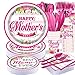 Happy Mothers Day PARTY SUPPLIES: The pink dinnerware set features hot pink flowers with Happy Mother's Day text, best mom ever dessert plate, happy mothers day napkin in the center for a celebratory them at your upcoming Mother's Day celebration.