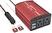 【Pro Chaser Power Inverter Basics】: Our inverter produces 300 Watts continuous DC to AC power and 800 Watts instantons power, with dual 110V AC power sockets and 6.2A dual USB ports (3.1A each) power outlets.