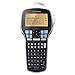 Handheld label maker has 2 line printing, 5 font sizes, 7 print styles, 8 box styles; 9 label memory, date stamp, and 3 language options