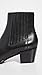 Crisscross ankle straps with elastic insets, Leather chain vamp strap, Rigid leather footbed, Column heel