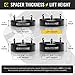 TECHNICAL NOTES: 2.5 inch front suspension leveling lift. *Please note that front spacer thickness to lift height is not a 1:1 ratio. Strut spacer installation alters the angle of the lower control arm, and this accounts for an additional lift beyond the actual thickness of the spacers.