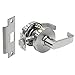 Latch by either lever unless outside lever is locked by push/turn button inside lever. Deadlocking latch