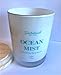 Glossy white glass jar with teal text; topped with flame-extinguishing lid