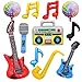 Package Including: You will get 11pcs inflatable rock star balloons, include:1pc inflatable boom box, 2pcs inflatable guitars, 1pcs inflatable microphones, 1pcs inflatable saxophone, 1 pcs black Single music note,1 pcs blue single music note,1pcs gold double music notes,1pcs red double music notes,2pcs disco ball foil balloons