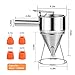 【Package】This batter dispenser package contains 1 x pancake dispenser for batter with stand, 1 x grip handle and 4 x different caliber silicone funnel.Silicone funnel sizes are: 0.31", 0.47", 0.55", 0.67" and the dispenser itself has a 0.75" spout. Capacity: 2.5 cups / 0.6 liters.