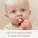 Design: This teether is right-sized for little hands, with built-in handles, and textures to help with developmental growth while satisfying the baby's need to soothe tender gums