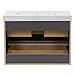 Open cabinet space and soft-closing full-extension side drawer provide flexible storage options and easy access to plumbing