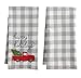 The one print towel features an appliqued vintage red truck with a tree in the back and happy holidays writing on top. The truck is also embroidered. The other towel is a plain gray and white checked.