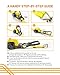 EASY TO USE - See the image for 6 Easy How-To Steps. 1. Open the ratchet by lifting the lever and threading the loose strap end around the bottom rod of the spindle (ratchet handle) 2. Pull the excess webbing through and pump the strap tight until it is wrapped securely around your cargo load 3. Clip the lever down and your load is secure!