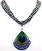 Rich and intense tones of blues, greens, pinks and gold swirl throughout this marine blue color hand beaded Peacock Feathers pendant. It is matched color for color by a gatherings of iridescent seed beads to create this lustrous necklace.