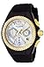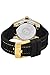 Black logo textured mother of pearl dial with gold tone and white hands and hour markers; luminous; unidirectional 14K gold ion-plated stainless steel bezel; screw-down crown; flame fusion crystal; 14K gold ion-plated stainless steel case; black silicone strap with gold contrast stitching