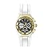 Silver dial Chronograph with day, date and 60sec sub dials with 10 white crystal markers, Gold tone and Stainless steel band, Push crown