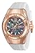Mother of pearl dial with rose gold hands and hour markers, 24 h, 60 m, and 60 s sub dials date display, white silicone band and screw down crown