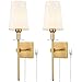 🌟Modern Gold Plug in Wall Sconces- This plug in wall sconce features a square plate and a slim lamp post matched with a barrel-shaped beige fabric lampshade distributing soft light, showing classic modern style and creating a comfortable and warm atmosphere in your interior room.