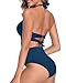 Deep blue retro top with high waist bottoms bathing suits makes you look amazing during a beach vacation, in a swimming pool, or honeymooning in Hawaii, etc.