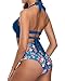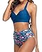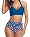 Blue flower retro top with high waist bottoms bathing suits makes you look amazing during a beach vacation, swimming pool, or honeymooning in Hawaii, etc.
