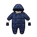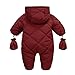 【Great Thick Quality】:Baby warm jumpsuit romper, outer layer made of polyester and acrylic fabric, lining layer composed of down cotton padding.Fuzzy lining all through out the sleeves, back, and hood. Multi-layer fabrics are fixed and stitched into a diamond shape, no easy to move fleece.Keeps baby super warm, nice fit too. Very cozy & adorable!