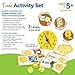 41-Piece Set includes plastic clock with movable hands, write & wipe clock, 24 double-sided analog and digital puzzle cards, 12 double-sided, write & wipe daily activity cards, 3 time dice plus activity guide.