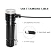 T1 torch powered by an included battery, built-in USB charging port and cable. Battery indicator displays the battery level.