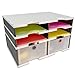 EVERYTHING YOU NEED IN ONE COMPACT, MODULAR SYSTEM - Overall Unit Measures just 19 1/8"w x 19 3/4"h x 13"d. Combines 10 letter tray compartments, 2 Supply & 2 Storage Drawers, and a Riser Storage Base into one compact organizer. Letter Tray Compartments each measure 9 1/16"w x 2 1/4"h x 12 3/4"d and Riser compartments each measure 9 1/16"w x 5"h x 12 3/4"d. The TierDrop Riser Storage Base raises your sorter 5 1/2" off your desk for unobstructed access to the lower compartments.