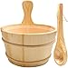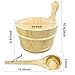 Bucket is 6.7''(17cm) in height, 10.5''(26.5cm) in diameter, measuring 5 liter (1.3 gallon) of water. The ladle is hand carved from a solid section of wood, the 15” long ladle easily facilitates pouring water over your sauna rocks.